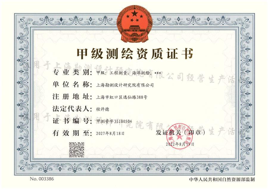 測繪甲級資質證書:工程測量甲級、海洋測繪甲級