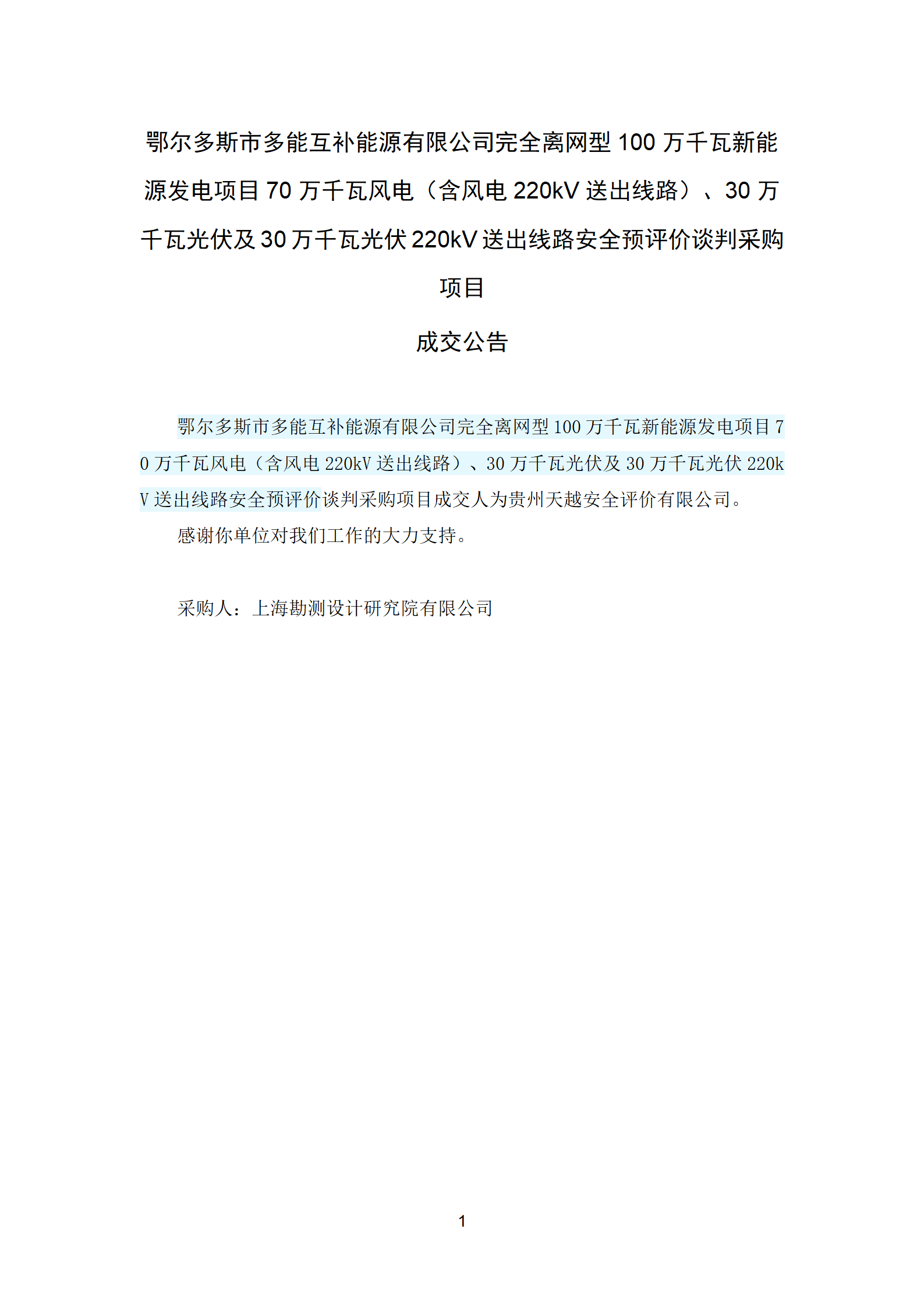 鄂爾多斯市多能互補(bǔ)能源有限公司完全離網(wǎng)型100萬千瓦新能源發(fā)電項(xiàng)目70萬千瓦風(fēng)電(含風(fēng)電220kV送出線路)、30萬千瓦光伏及30萬千瓦光伏220kV送出線路安全預(yù)評(píng)價(jià)談判采購項(xiàng)目 成交公告