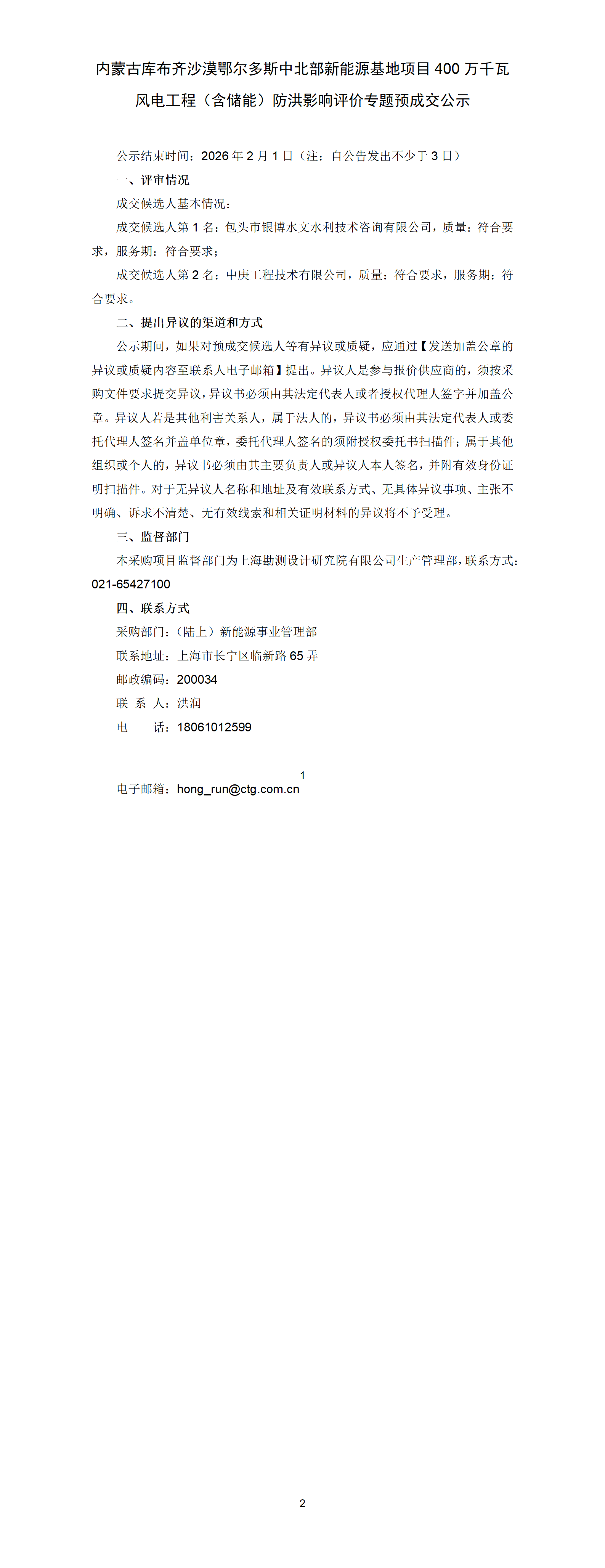 內蒙古庫布齊沙漠鄂爾多斯中北部新能源基地項目400萬千瓦風電工程(含儲能)防洪影響評價專題預成交公示